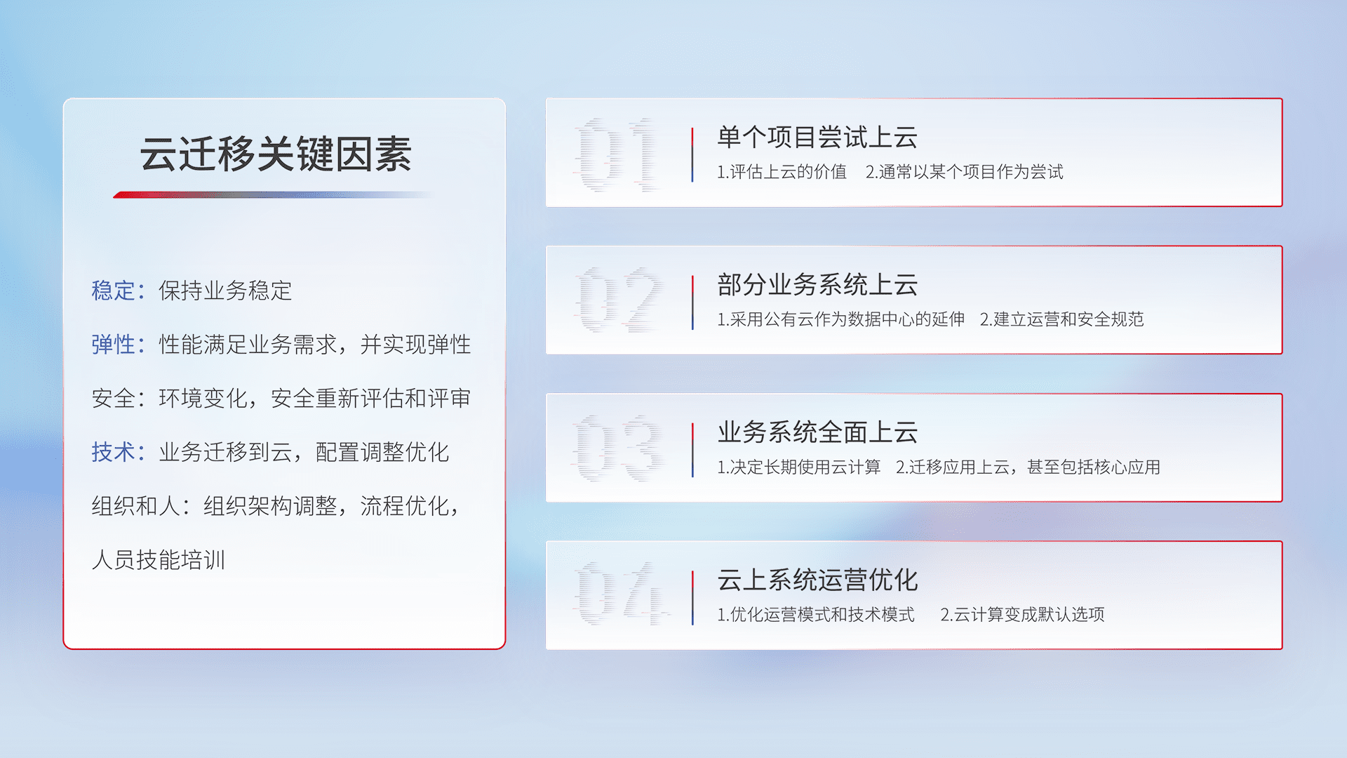 结合实际业务,,,从规划设计、、、、云平台选型、、云原生改造、、、、数据迁移、、、集成交付,,,,迁移全过程为客户识别最佳上云路径,,,做好风险识别管理,,设计网络架构、、身份权限、、、、安全审计合规、、、、操作审计、、日志审计、、、、监控告警策略、、多站点容灾设计等,,,对云上基础设施进行整体规划,,,提升IT治理水平,,,以满足弹性、、、、高可用、、、高性能的需求。。。。