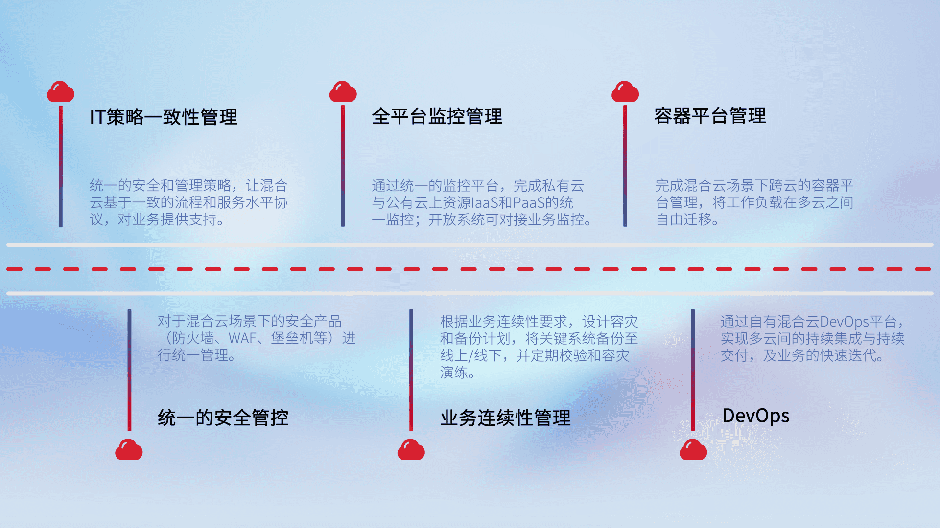 通过多云纳管,,,以统一的资源数据模型把客户的云资源进行抽象和封装,,,进而实现对多云资源的统一操作,,,,保障云资源管理的可靠性、、、稳定性与可用性。。。。量身定制化运维内容,,,配置、、、、开发运维、、、补丁管理、、、备份、、监控、、认证和访问管理、、、审计和日常巡检等,,保障在用云过程中的可靠度,,稳定度以及高可用率。。