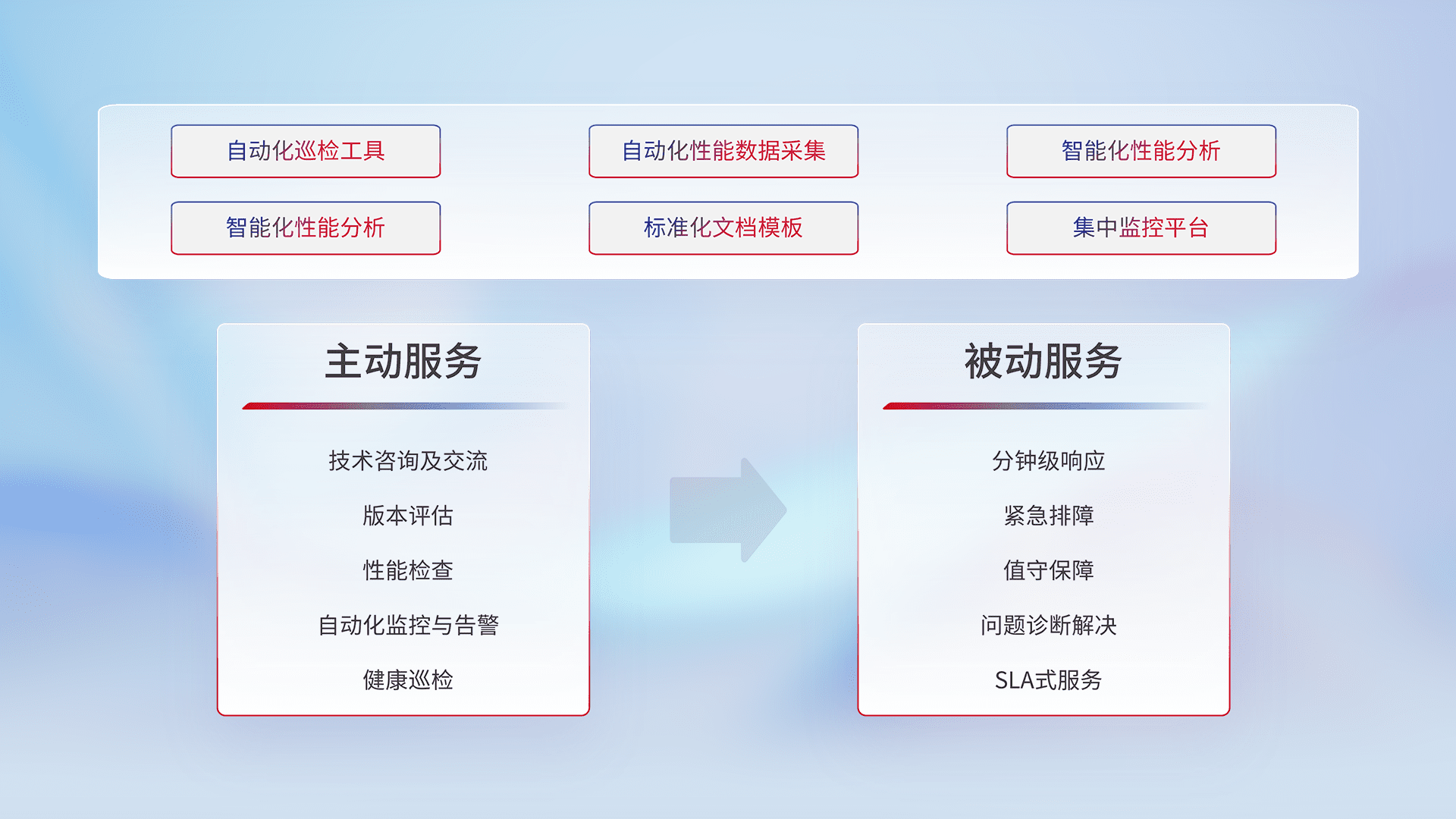 智能化工具和标准化文档,,,保障服务质量,,提供主动服务(包含技术咨询、、、版本评估、、性能检查、、自动化监控与告警、、、健康巡检)和被动服务包含(分钟级响应、、、、紧急排障、、、值守保障、、问题诊断解决、、、SLA服务)。。。